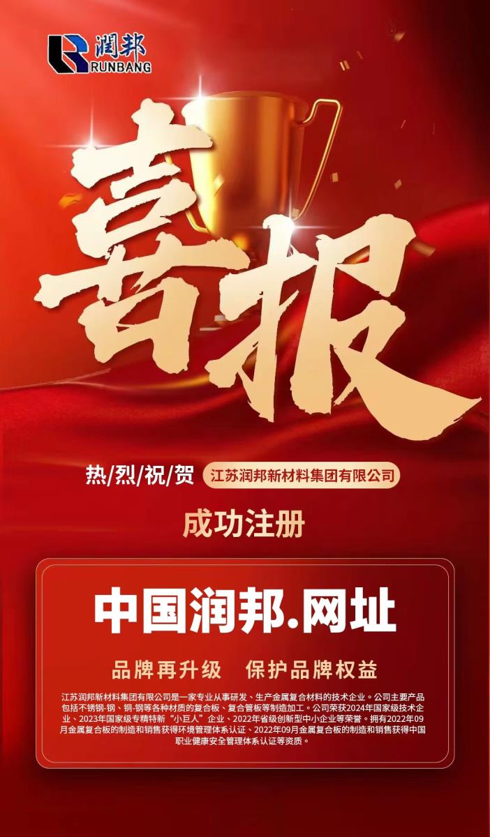 江蘇潤邦新材料集團有限公司是一家專業(yè)從事研發(fā)、生產(chǎn)金屬復合材料的技術(shù)企業(yè)。公司主要產(chǎn)品包括不銹鋼-鋼、銅-鋼等各種材質(zhì)的復合板、復合管板等制造加工。